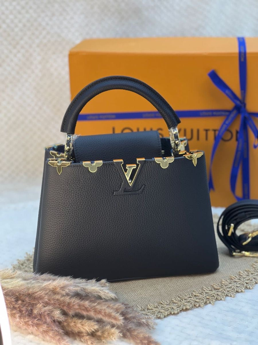 LOUIS VUITTON BLACK TAURILLON LEATHER FLOWER CAPUCINES PM BAG